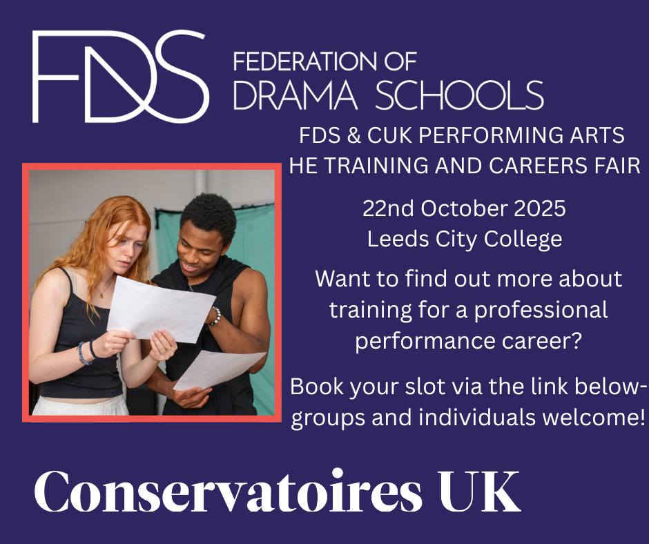 We're looking forward to returning to Leeds City College on the 22nd October 2025, for the FDS & CUK Performing Arts HE Training and Careers Fair- and are open now for bookings from individuals and schools, colleges and youth theatre groups.